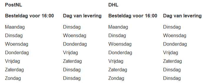 Let op: deze levertijd is opgegeven door PostNL en DHL, het kan voorkomen dat een zending later wordt bezorg helaas hebben wij geen invloed op eventuele vertraging tijdens het verzend proces.